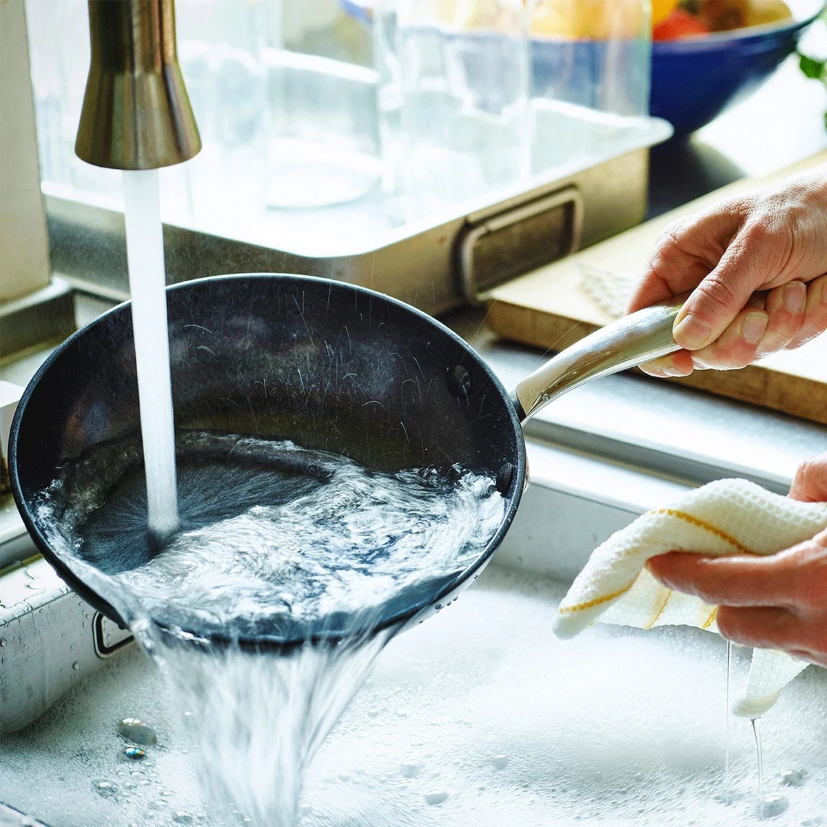 - Laat de koekenpan volledig afkoelen voordat je ze schoonmaakt om te vermijden dat de pan kromtrekt.