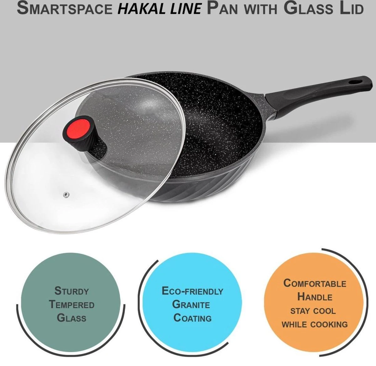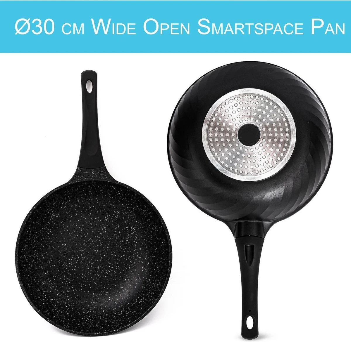 De wokpan heeft een anti-aanbaklaag met zwartmarmeren afwerking die ervoor zorgt dat het eten niet blijft kleven aan de pan en minder olie of boter nodig is.