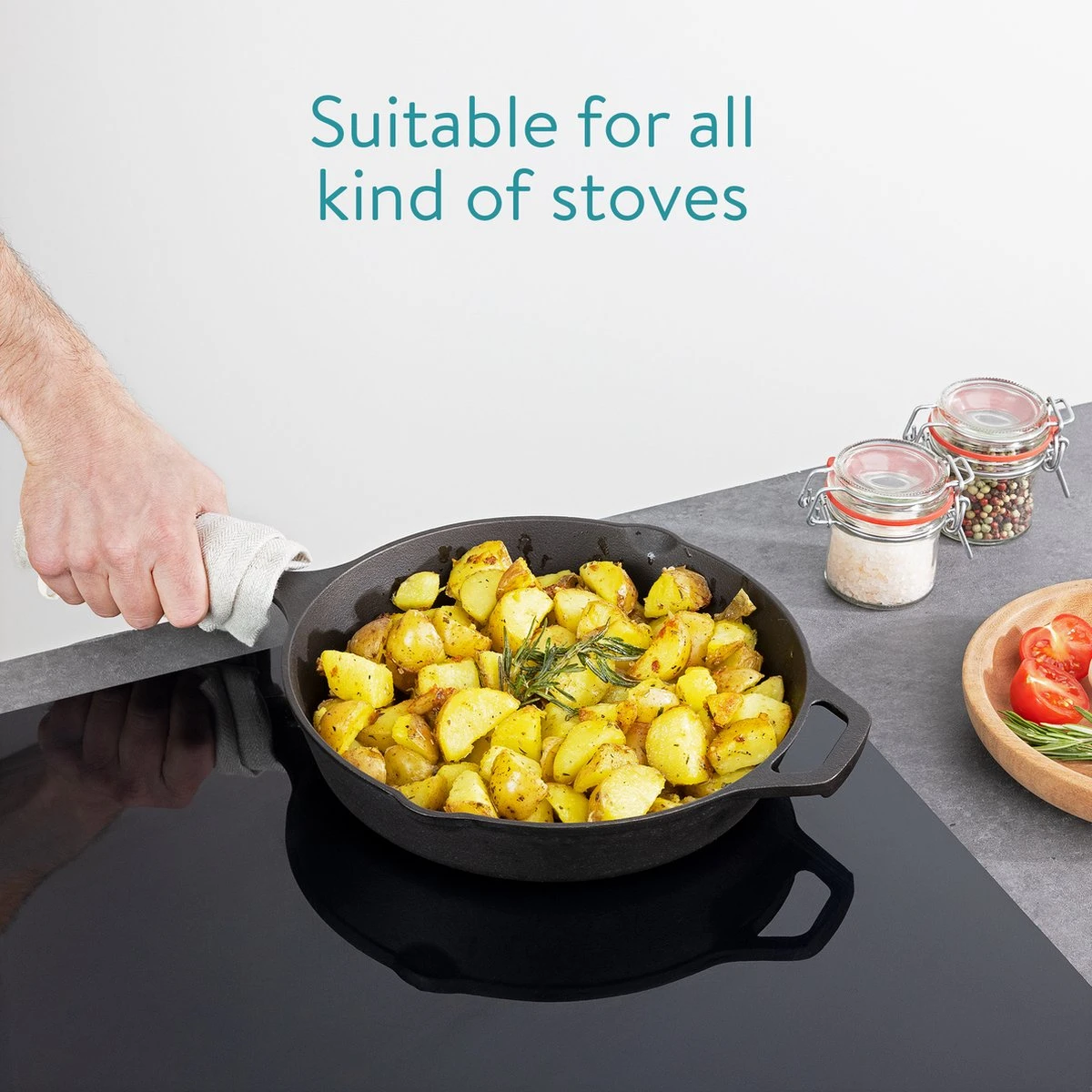 - VEELZIJDIGE PAN: De gietijzeren koekenpan van Navaris is ontzettend veelzijdig. Vlees braden, pannenkoeken bakken, een stoofschotel bereiden of pizza maken – het kan allemaal in deze pan van gietijzer.