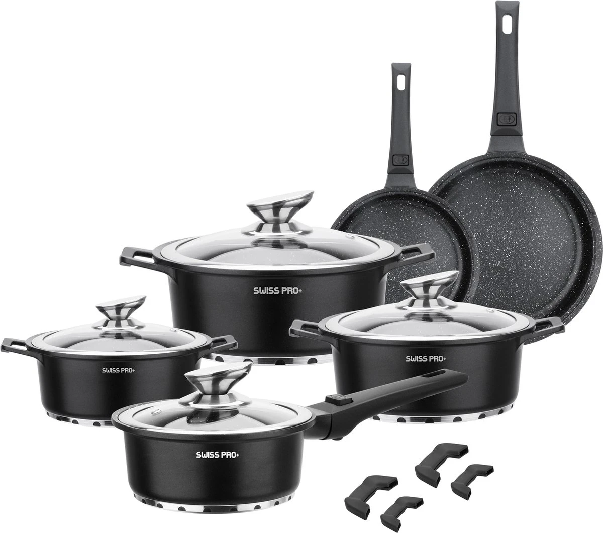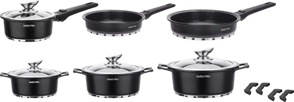 Swiss Pro+ | Set 14 Delige Pannenset | Inductie – Pannensets – Glazen deksel – Met afneembare handgreep – Marmeren interieur -PFAS-vrij | Black (Zwart)