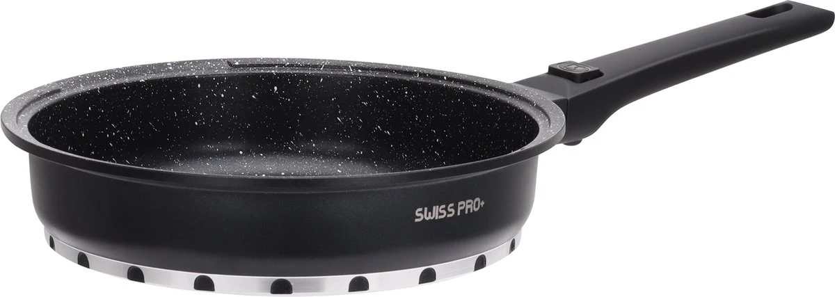 De Swiss Pro+ pannen worden tijdens het koken gelijkmatig warm, waardoor je een mooi egaal gebakken product krijgt. Daarnaast zijn de pannen vaatwasmachinebestendig, milieuvriendelijk en energiebesparend. De meegeleverde glazen deksels hebben een handig stoomventiel. De pannen hebben rubberen grepen aan de handvatten waardoor brandende handen verleden tijd zijn. Ergonomische panhandvatten hebben een ophanglus. Doordat het handvat afneembaar is, past de pan ook gemakkelijk in de oven of vaatwasser.